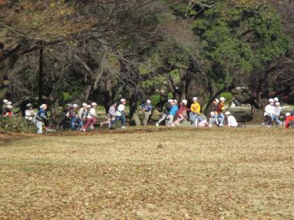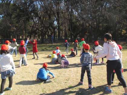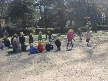 1年生が、用賀小学校との交流会を砧公園でしています。それぞれのクラスを分けて用賀小学校のお友達とゲームや競争を楽しんでいます。ちょっと寒いけれど、子どもたちは元気に走り回っています。