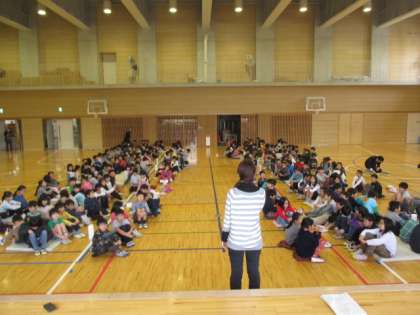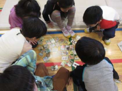 3年生は、京西小学校の体育館で、用賀小学校の3年生と交流会をしました。用賀小と京西小の子どもたちがグループになって、自己紹介をして、学校のことを紹介しあった後は、「せたがやかるた」で一緒に遊びました。だんだん夢中になって、大きな声や、頭を付き合わせながら楽しく交流ができました。