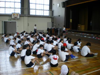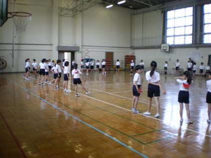 今日の2時間目にキャンプファイアーの練習を行いました。キャンプファイアー係りの司会進行の元、歌を歌ったり、ダンスをおどったりしました。特にダンスでは大きく円になり、「マイムマイム」をおどりました。キャンプファイアー係りは休み時間や放課後に話し合い、みんなが楽しめるようなキャンプファイアーを考えてきました。