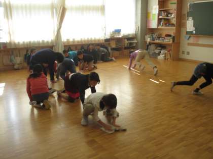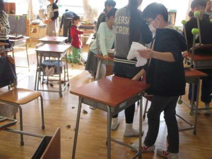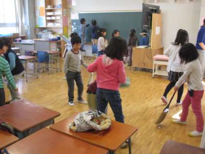 今日は、大掃除です。どの教室も机を廊下に出して、教室をきれいにしています。お世話になった机や椅子、黒板などもきれいに拭いています。教室の床もみんなで雑巾がけです。