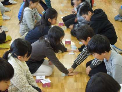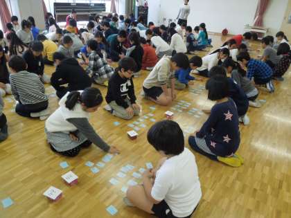 5校時に、4年生全体で百人一首大会を行いました。競技かるたの形式で、対戦相手を変えながら5回戦を行いました。