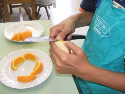 家庭科では、川場移動教室の飯ごう炊さんでのカレー作りのために、包丁の使い方を練習しています。大里先生のご協力により、オレンジとりんごを切りました。りんごの皮をむいたりしている子もいました。その後はきれいに盛りつけて頂きました。