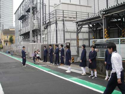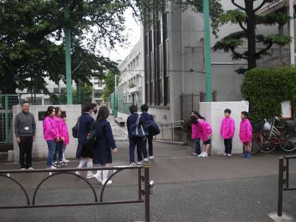 12日13日は、1学期のおはようコミュニケーションデーです。京西小の児童会の子どもたちは用賀中学校に行ってあいさつしています。ピンクのジャンパーがよく似合います。