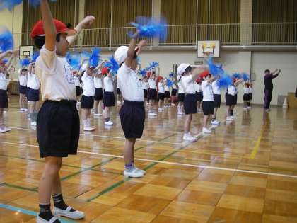 14日の2時間目、体育館から1年生の元気な声が響いてきました。運動会のダンスの練習をしていたのです。