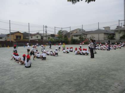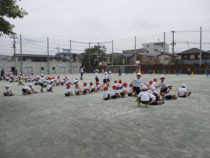 1年生の合同体育です。折り返しリレーをしています。カラーコーンを回って、走り、次の人にタッチします。最初はやり方がわからず困っていた子もいましたが、徐々になれてきてスピードもアップしました。よくがんばって走っていました。