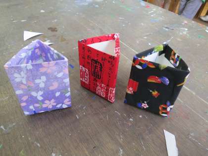 今日の「このゆびとまれ」は、和紙や紙ナプキンを使った作品を作りました。カードケースやもの入れ、鉛筆立てを作りました。