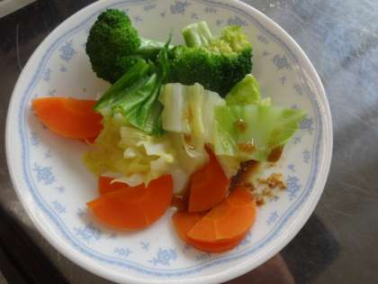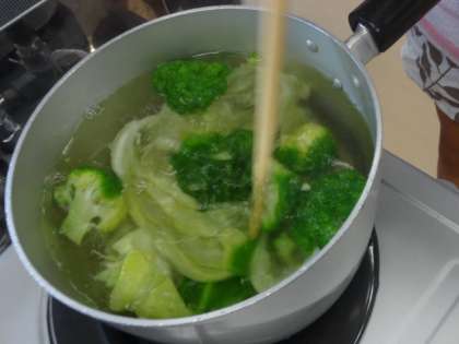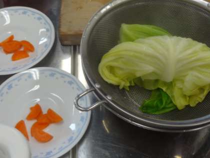 にんじん、ブロッコリー、キャベツをゆでて、ゆで野菜サラダを作りました。野菜をゆでて変化する様子を楽しみながら、「にんじんを同じ大きさに切った」「ていねいに盛り付けた」とそれぞれが工夫した実習となりました。