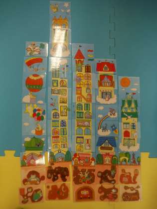 小集団活動の中で、「キャラクターの町」というゲームに取り組みました。カードに1枚1枚、建物や町の風景の一部が描いてあり、それらのカードを順番に1枚ずつ並べて組み合わせていくと、町ができるというゲームです。カードの出し方のルールを守り、お互いに声をかけ合って協力することがねらいです。