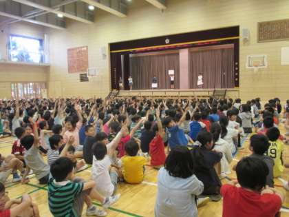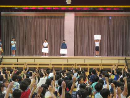 今朝の集会は、集会委員が考えた「新しい先生の特徴当てクイズ」でした。新しくいらした先生の趣味や好きなことなどを紹介するクイズでした。それぞれの先生の特徴がわかっておもしろい集会でした。