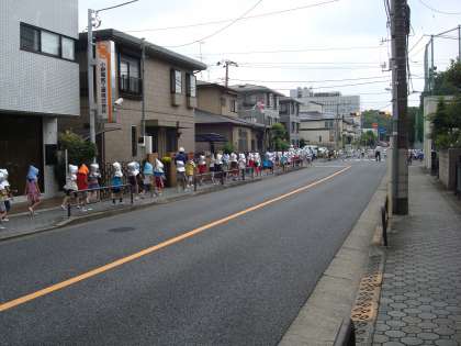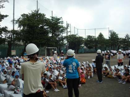 今月は、地震の後、火災が発生し、校庭に消防車が入ってきたため、学校の外に更に避難するという2次避難の避難訓練を行いました。
