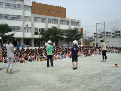 今月は給食室から火災が発生したという想定で、放送を聞いて、避難経路を確認しながら第一避難場所である校庭に避難しました。