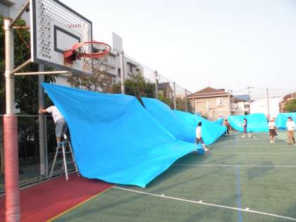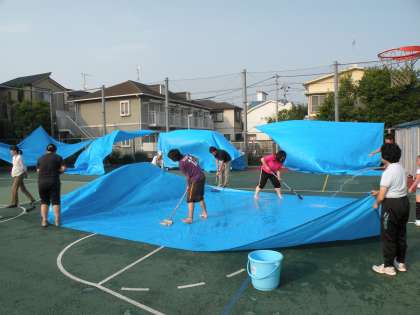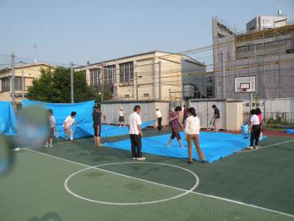 今日は快晴です。教職員総出でブルーシートを洗い乾かしました。風に舞い上がるブルーシートをくぐりBОPの子どもたちが遊んでいます。