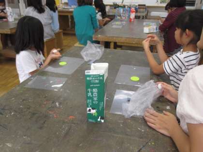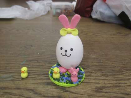 今日は低学年のミニチュアンインエッグの日です。紙粘土と卵の殻を使ってかわいい置物を作りました。