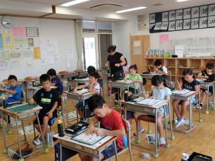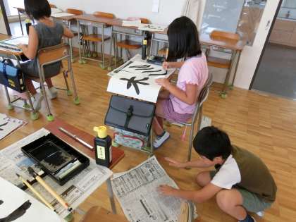 「書道を楽しもう!」では、お手本を見ながら自分の名前を何度も練習した後、「木」「光」「出発」などの字に挑戦しました。