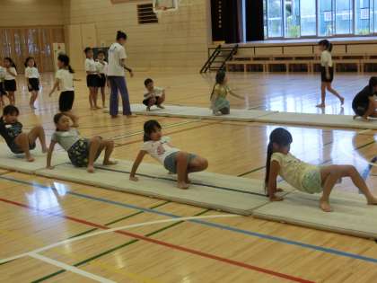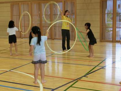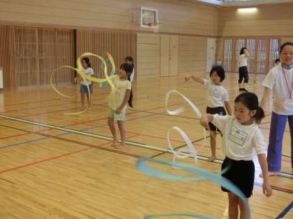 マットの上で開脚前転や側方倒立回転、倒立前転などの練習をした後、リボンやフラフープを使って新体操の基本的な動きを教わりました。