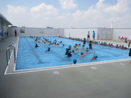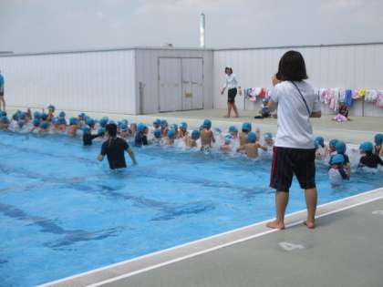 1年生のプールの時間です。夏休みにたくさん来た子、海や川で泳いだ子、いろいろですが、体育の学習「水遊び」では、みんな元気に活動していました。