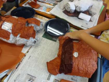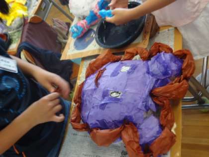 ビニール袋に新聞紙をつめて、はりこの型を作りました。お花紙にのりをつけて何枚も重ねます。乾いたらお面を土台からはずして遊びます。かぶって遊ぶと変身気分です。