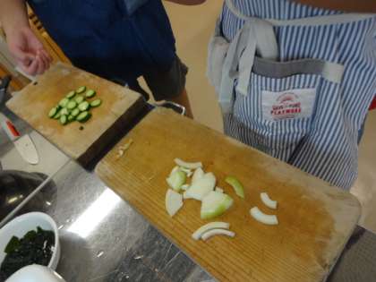 献立をみんなで考え、栄養や色どりを確かめながら、調理実習を行いました。どのグループも食材の切り方や手順を考えながらおいしく作ることができました。
