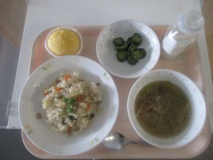 今日の給食は、三校合同食育の日の献立です。中国の献立で、チャーハン、牛乳、中華スープ、きゅうりの中華づけ、マーラーカオです。使用食材産地は、米 埼玉、卵 青森、豚肉 神奈川、ハム 群馬・千葉・茨城、たまねぎ 北海道、にんじん 北海道、ねぎ 青森、しょうが 高知、にんにく 青森、もやし 群馬、キャベツ 群馬、きゅうり 群馬、たけのこ 福岡・熊本です。