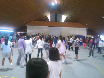 村の会堂で室内レク。三つ巴のドッチビーをしました。