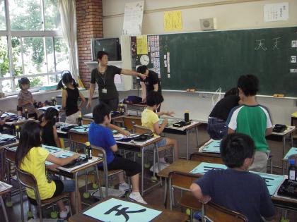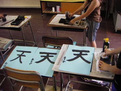 半紙ではなく、水色の画用紙に墨でかくと思いのほか、文字が浮き上がって見えています。とても素敵なお習字教室です。