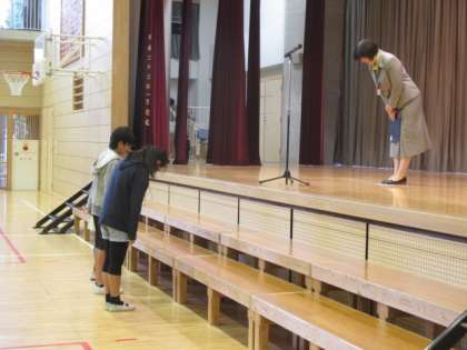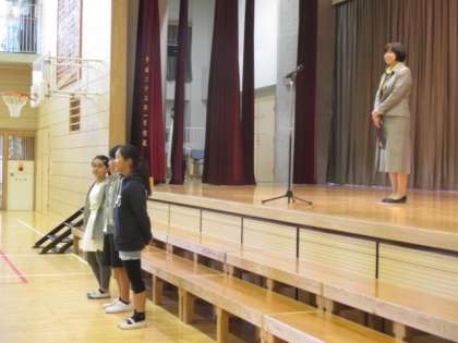 毎週の全校朝会で、6年生が前に立ち、季節の話や行事の話を発表してくれます。その後、全校児童の前で挨拶を率先して言っています。
