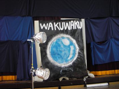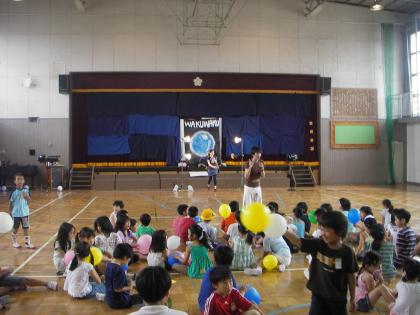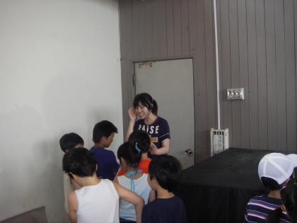 体育館の舞台全体が大きな暗室になっています。舞台にのぼると、真っ暗です。その中に一箇所小さな穴が開いています。その穴をじっとみると外の景色が映って見えるという仕掛けになっているのではないでしょうか。カメラオブスキュラ、カメラの原理の原点の仕掛けのようです。たくさんの子どもたちが参加しています。大盛況です。学生の人たちも汗だくで取り組んでくれています。