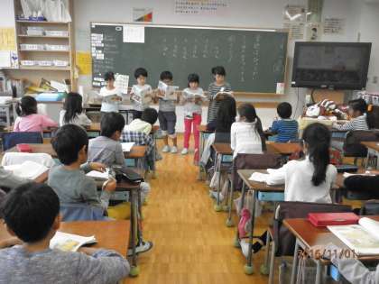 国語の学習では、「きつねのおきゃくさま」の音読発表会をしました。主人公のきつねの気持ちを想像しながら、読み方を工夫したり、台詞を付け加えたりしました。