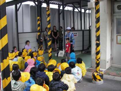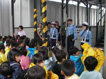 実際にいらか道を歩いて、安全な歩き方を教えていただきました。1年生は女性警察官の質問に元気よく答えていました。
