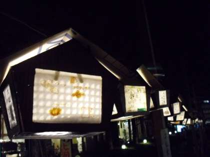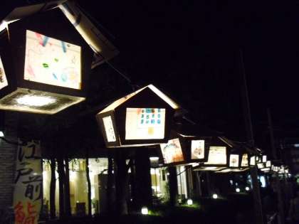 サマーステージ22 を飾るものとして提灯の他に大山灯篭がありました。昨年も50個ほど作りましたが突然の大雨で壊れてしまいました。ですから、今年も「このゆびとまれ」で50個作りました。段ボールを切ったり、ニスをぬったり、組み立てたり、子どもたちに絵を描かせたりとみんなで一つ一つ作り上げてきました。夜になり辺りが暗くなると俄然大山灯篭が引き立ってきました。美しい。サマーステージを美しく飾り、盛り上げていました。