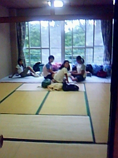 宿舎、梅屋敷に到着です。庭には鹿がやってくるほどの広く、歴史のある宿舎です。開園式を行い、若女将さんが笑顔で迎えてくれました。各部屋に入りました。14畳に6人から8人が泊まります。意外に広く、余裕がありそうです。男子と女子の部屋をちょっと失礼して写してみました。避難訓練をやり、子どもたちは、お風呂に入ります。