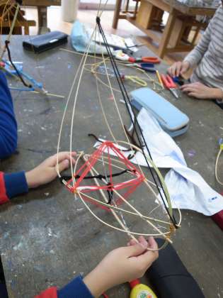 5年生の図工では、「おしゃれなクモのす」づくりが始まりました。線材を組み合わせて、飾れるクモの巣をつくるという題材です。竹ひご、針金といった同じ材料から、こんなにもそれぞれに違う形ができるのか、と驚かされます。これからどんな作品に仕上がっていくのか楽しみです。