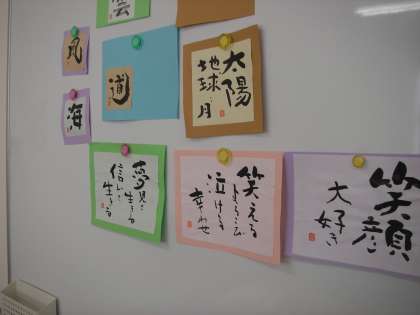 京西アカデミー26日は会議室で「好きな言葉を筆で書いてみよう」です。副校長の溝口先生が講座を開いてくれました。見本で掲示された溝口先生の書かれた習字はとても素敵です。習字というより書道といった感じです。