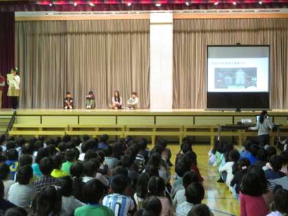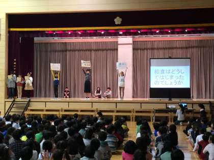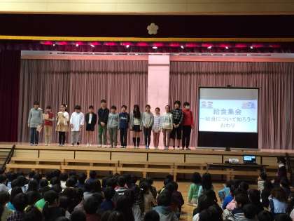 今朝は、給食委員会の発表集会でした。給食の歴史や意味などわかりやすく発表していました。昔の給食を見てみんなびっくりしたようです。