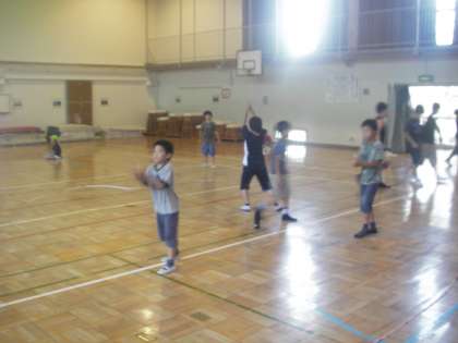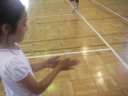 図工室では竹とんぼを作りますが、体育館では竹とんぼ飛ばし大会です。どのくらいの距離を飛ばすことができるかを競いました。みんな竹とんぼを上手に飛ばしています。9メートルを越えて飛ばす人もいました。竹とんぼの性能が良いことも飛ばしやすい原因の一つです。上手に竹とんぼのキャッチボールをしている子もいました。みんななかなか上手です。