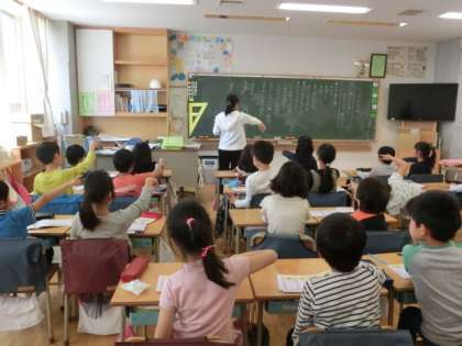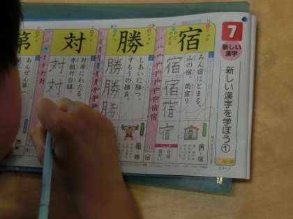3年生が漢字の学習をしていました。字形と書き順を確認するために空書きをした後にドリルに書き込みました。書いた後は先生に丸付けをしてもらいました。