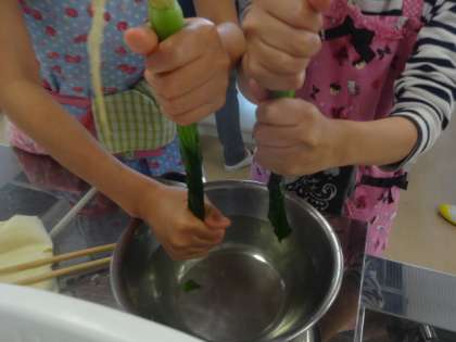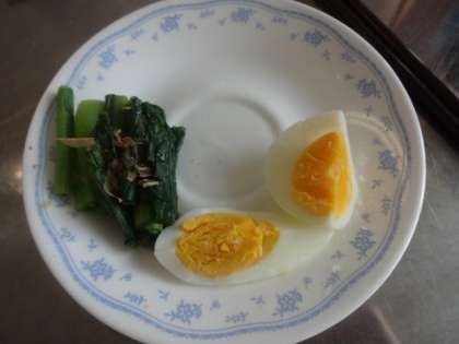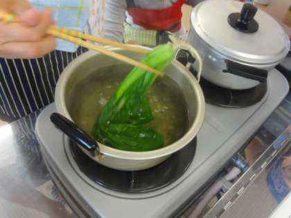 用具を安全に使い、青菜と卵をゆでました。青菜はゆでることによってかたさが変わり、色が濃くなることを実感できました。みんなで協力して安全に調理しました。