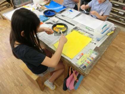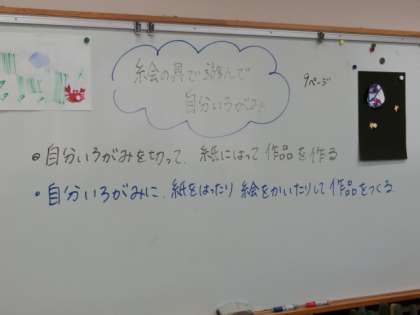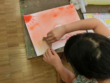 筆の代わりにブラシと網や段ボール、ローラー、スポンジなどを使って水彩絵の具の絵を描きました。道具の特徴を生かして素敵な絵を描けました。