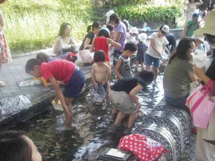 23日は用賀町会の「納涼の夕べ」でした。3時からはドジョウつかみどりです。一回50円です。たくさんの子どもたちが参加しています。「こんなにとったよ」と見せてくれます。子どもたちの楽しそうな顔がとてもいいです。