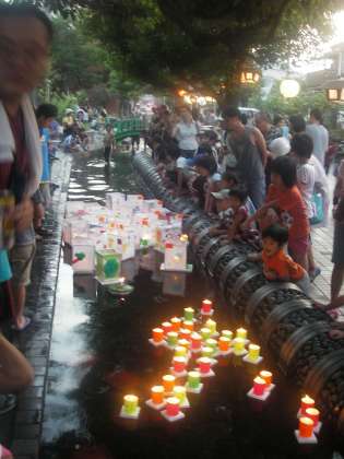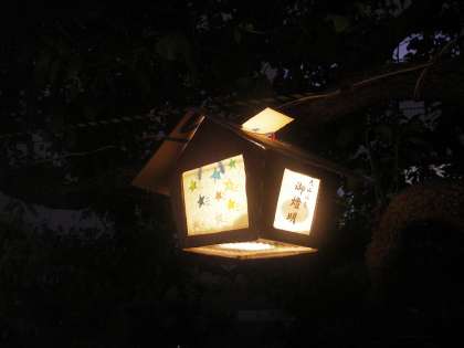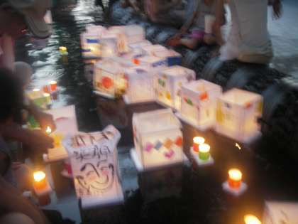 夕闇がせまると、灯籠舟コンクールが行われました。京西小「このゆびとまれ」で作った灯籠がうかべられました。審査員から推薦された灯籠が最後に発表されました。豪華な賞品が渡されました。もちろん灯籠を作って参加した人には全員に参加賞が配られました。大人の部でだした校長の灯籠も賞をいただきました。有難うございました。