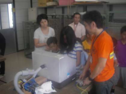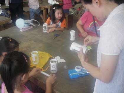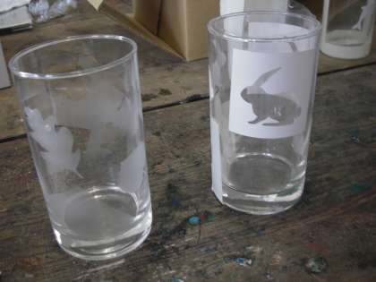 24日の京西アカデミーを紹介します。まず、サンドブラストです。物・手作りの会の松本さん、岡本作業所の方々が開いてくださいます。コップに紙(シール)を張り、図柄を切り取ります。それに圧縮空気で砂を吹きつけます。紙(シール)のところは透明なままですが、紙(シール)が張られていないところは、ガラスが白くなり、図柄が浮き上がるのです。myグラスの出来上がりです。