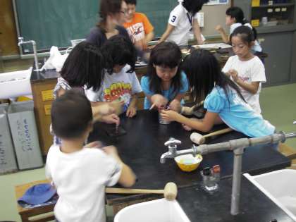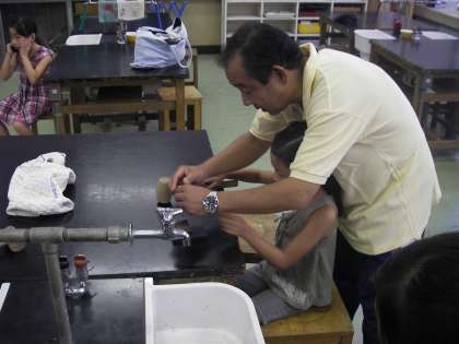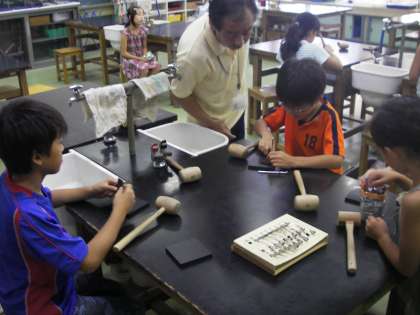 京西アカデミー、理科室では革細工教室が開かれていました。玉川台児堂館の方々が材料、道具等をすべて準備して実施してくれました。革に金型を当て、木槌でたたきます。そうすると革に模様ができるのです。最後に穴をあけ、そこに紐を通します。
