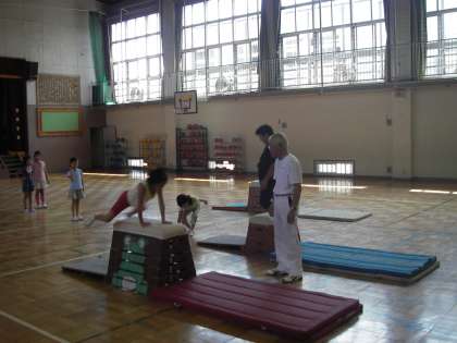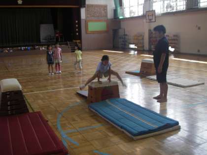 2回目の今日は低学年がちゅうしんです。体育館の中はとても暑かったです。水分補給をしながら子どもたちは一生懸命に跳び箱に挑戦です。何人もの子が上手に跳んでいます。石井先生、溝口副校長先生、増田先生が本当に熱心に指導してくれました。