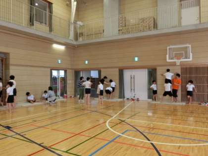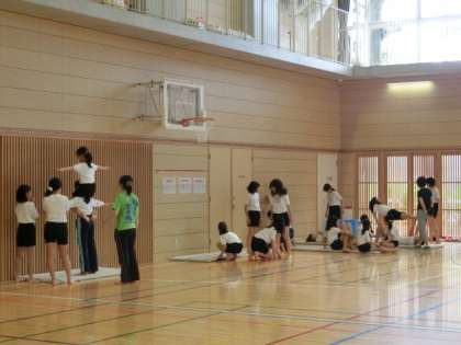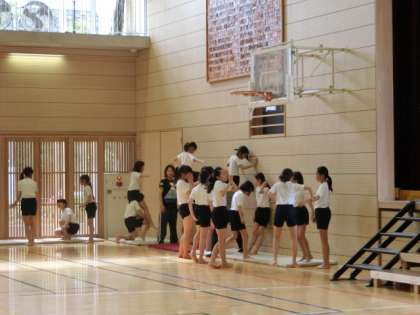今日は二人技の肩車とサボテンの練習をしました。難易度が高い技なので、6年担任以外にもたくさんの先生が補助しました。6年生が成功するようにみんなで支えていきます。