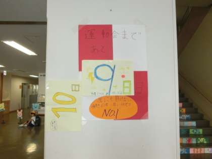 来週の運動会に向けて様々な準備が進行中です。代表委員がカウントダウンポスターを1階の階段横に貼り出しました。マスコットキャラクターのポスターも作成中です。応援団は各教室に行って応援歌やエールのやり方を教えています。