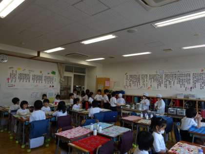 1年生がとても楽しみにしている給食の時間です。運動会の練習で、お腹がへっている児童がたくさんいます。そんな中、給食当番は仕事にも慣れて、手早く配ぜんができるようになりました。たのもしい姿が見られて、うれしい限りです。