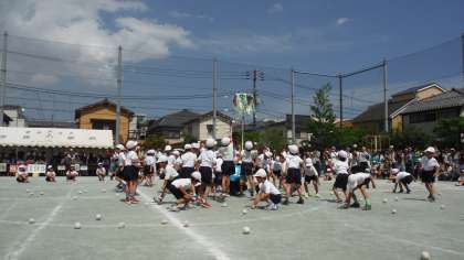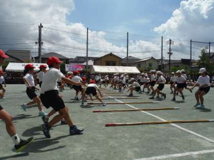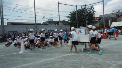 1年生は玉入れの合間にPPAPのダンスを挟みました。2年生は4人で息を合わせて箱運びをしました。3年生は数人グループで力を合わせて棒引きをしました。