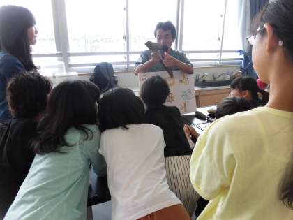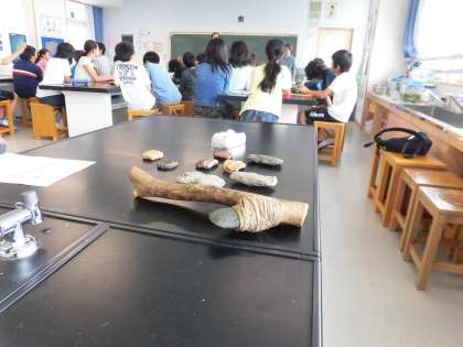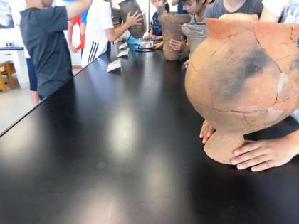 世田谷区の教育委員会文化財係の学芸員さんに手ほどきをいただきながら、本物の縄文土器、弥生土器、古墳時代の土器や、石器、矢じり、石のすり鉢などに実際に触れて、考える学習をしました。