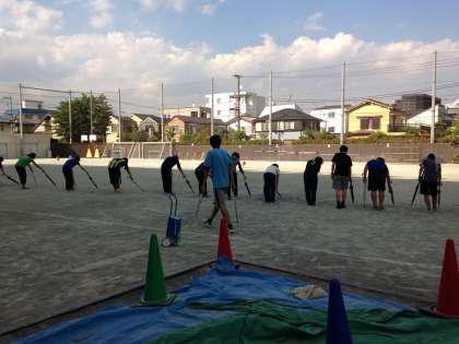 実はこれ、明日のスポーツテストで行う、ソフトボール投げのおうぎ型の線を引いているのです。この傘の下にはメジャーがあり、そのメジャーは校庭の片隅を中心に固定され、円を描くように動かしている先生がいるのです。