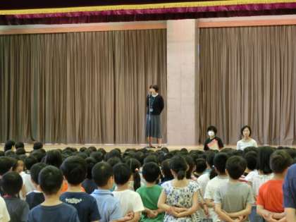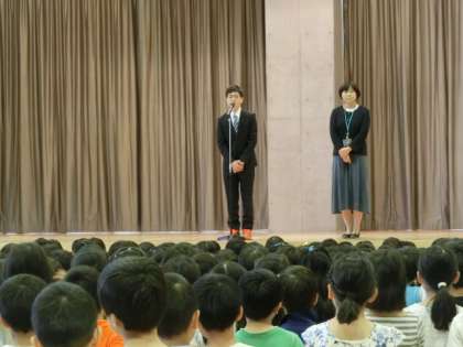 今日の全校朝会では、校長先生から友達と気持ちよく学校生活を送るためにはお互いに自分の行動に責任を持つこと大切だということを教わりました。また、6月中に4年1組で教育実習をする尾場瀬 浩之先生と初めましての挨拶をしました。野口先生から今週のめあて「階段や廊下は静かに歩きましょう。」についての話を聞きました。